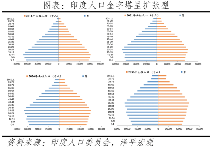 印度人口结构类似于中国的“昨天”,人口总量大、人口结构年轻等,具备一定的人口潜力。2023年印度人口总量超14.2亿,已超过中国成为世界第一人口大国,劳动人口数量与中国相近,人口金字塔呈扩张型,且人口比中国年轻。但印度还存在劳动力抚养负担重、区域教育水平分化严重、高等教育入学率低、种姓制度导致社会贫富差距扩大、就业机会有限、失业率较高、女性劳动参与率低、饥饿人口数量大、儿童消瘦、发育迟缓率较高等一系列问题。因此,印度复制中国人口红利之路较难。