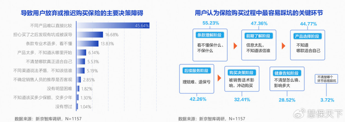 决策困境的另一根源在于信息处理层面——用户并非“不想买”,而是“不会选”。报告显示,45.64%的用户将“不同产品难以直接比较”列为放弃或推迟购买的首要原因,这一比例是第二名的近三倍,远超保费价格等其他因素。