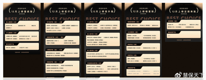 在此背景下,以深蓝保为代表的第三方保险测评为用户决策提供了重要参考。以2025年12月为例,深蓝保测评了市面上各大机构的产品,最终挑选出每个类型下3-5款优选产品,形成深蓝保金榜榜单。