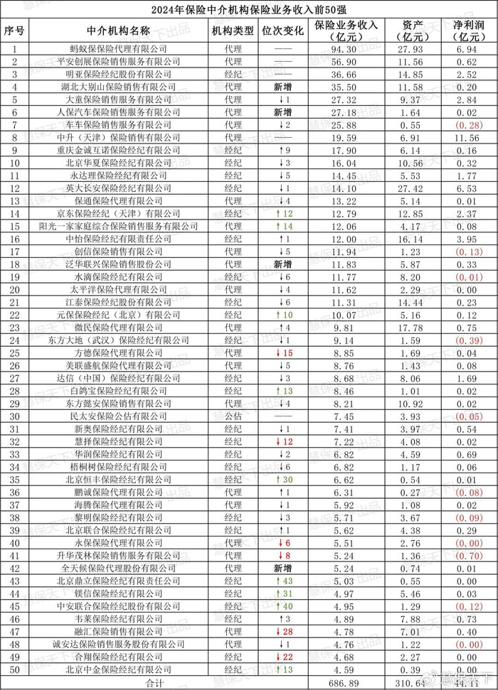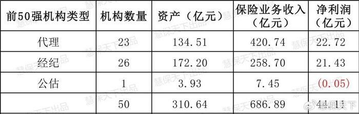 统计数据显示,2024年,专业保险中介机构前50名中,有26家经纪机构、23家代理机构及1家公估机构。合计总资产为310.64亿元,合计保险服务收入686.89亿元,合计净利润达到44.11亿元,净利润占比全行业高达93.31%,头部效应明显。