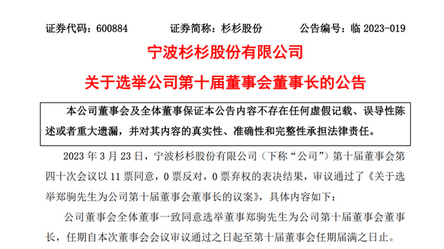 3月23日,杉杉股份第十届董事会第四十次会议以11票同意,0票反对,0票弃权的表决结果,选举郑驹接替父亲郑永刚出任公司第十届董事会董事长,正式接管市值近400亿元的新能源企业杉杉股份。