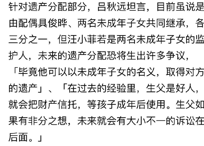 退一步讲,就算大S把钱留给子女,汪小菲在孩子成年前,也将掌握这些遗产的实际支配权,因为按照规定,在一方过世后,未成年子女的监护权将依法转移到前夫汪小菲手中。