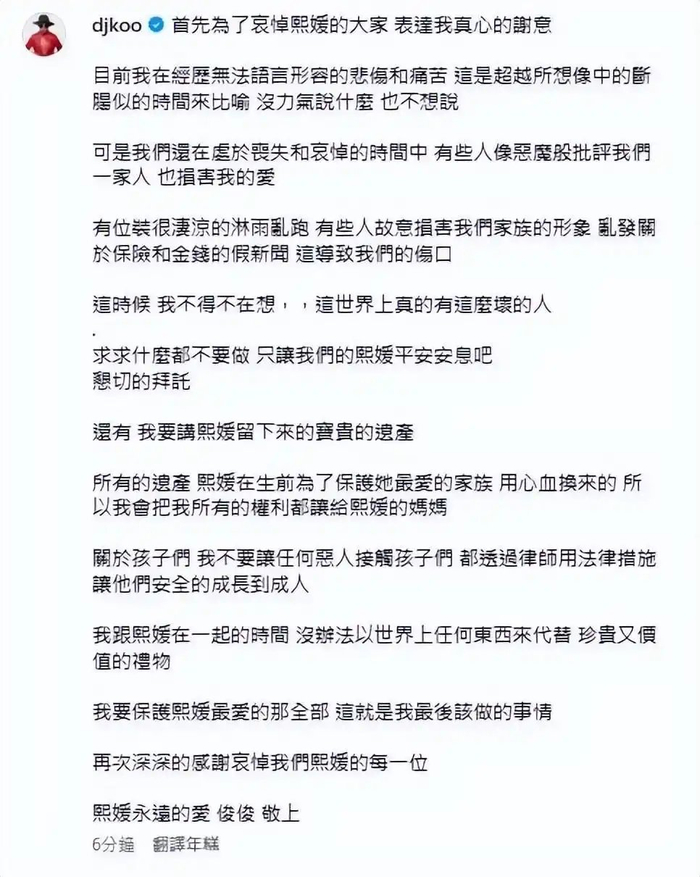 他也在2月6日晚间发文,表示要将遗产权利全都留给S妈,不让恶人接触孩子。