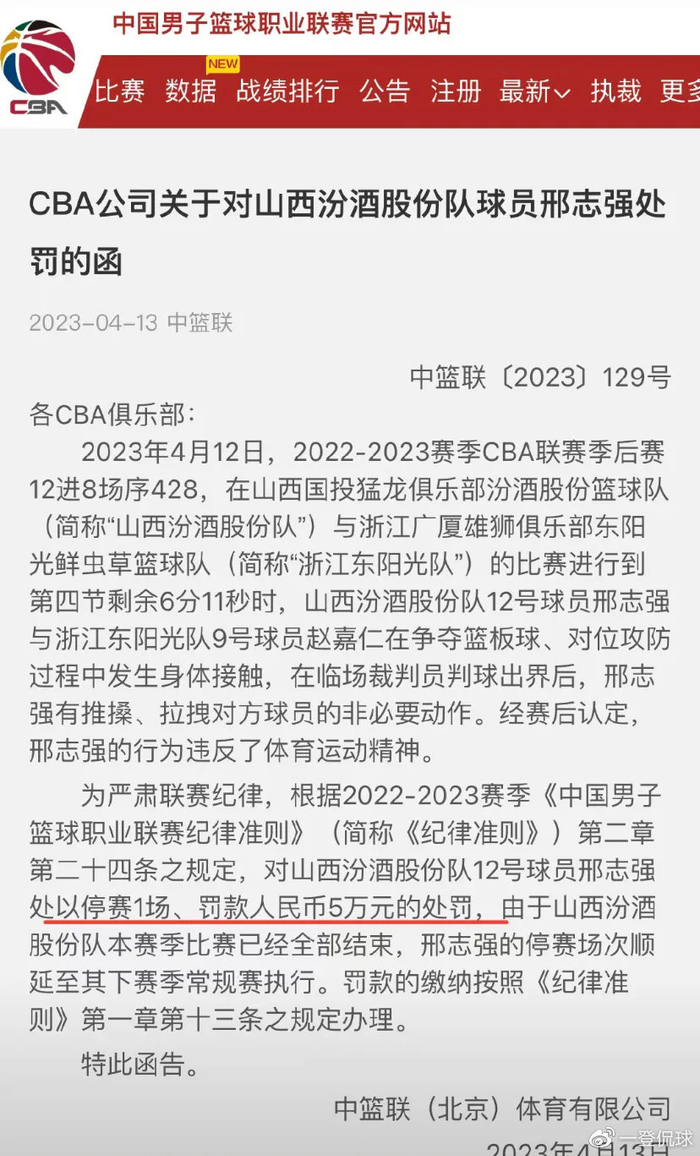 关于邢志强的罚单也是火热来袭,这次邢志强被罚款5万元人民币禁赛一场,如此重罚也彰显了CBA官方的权威性。山西男篮这次真是赔了夫人又折兵,不仅被浙江广厦男篮2-0横扫出局,现在球队主力球员邢志强也被禁赛罚款,12进8的系列赛山西男篮打得太憋屈了。