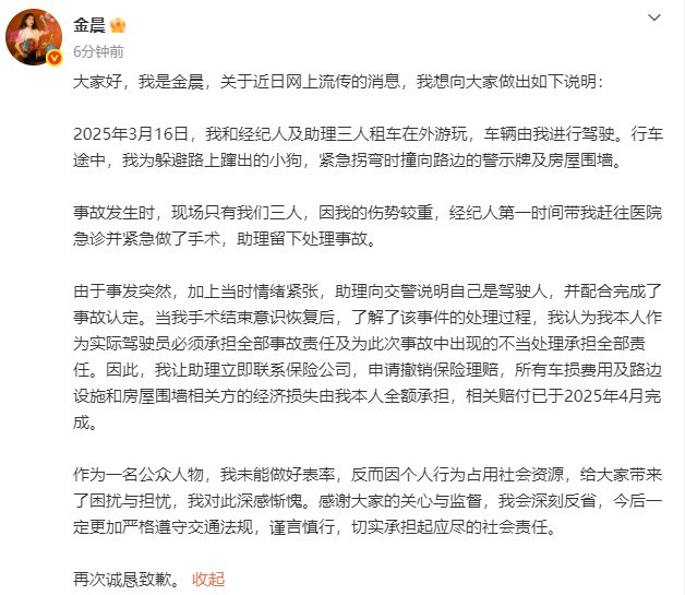 金晨晒脸部受伤照回应,金晨肇事逃逸事件说明,咱就说看样子伤的不轻啊当时,未来还是希望能够安全驾驶啊~