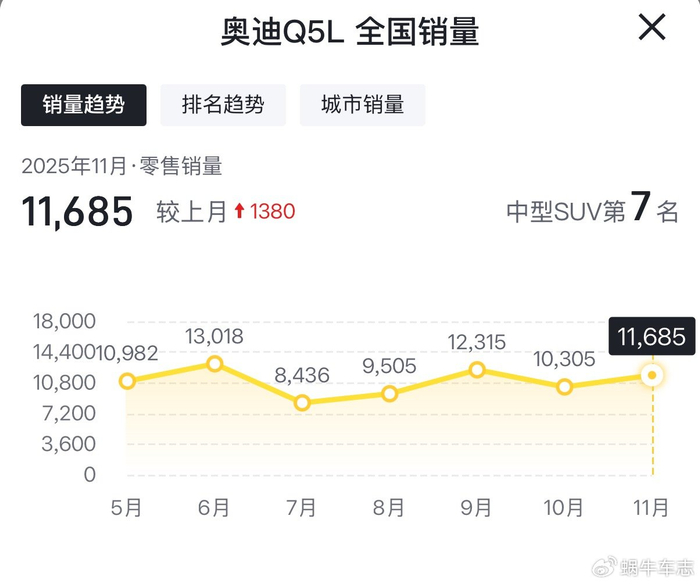 虽然全新一代更香,但现款也不能说就直接该pass掉了,毕竟已经到来新旧交替节点,现款Q5L在2025年年底,它仍然是月月过万的强劲表现,甚至超越已经换代过的奔驰GLC/宝马X3。