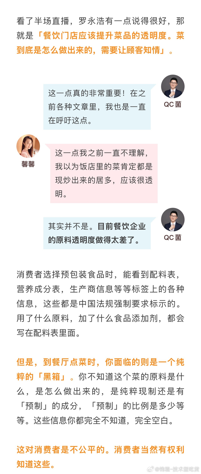 餐饮门店应该提升菜品的透明度。菜到底是怎么做出来的,需要让顾客知情。