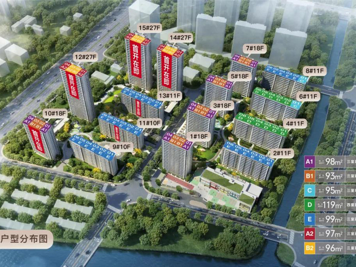 笙花府由15栋高层和小高层组成,层数为10-27层,项目总户数1104户,户型建面约93-119㎡,目标客户群为刚需购房者,但也有119㎡的改善户型可供选择,整体户型方正,产品力在线,外立面通透。