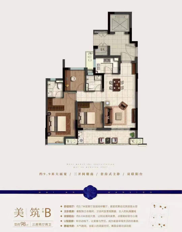 99㎡户型进入入户门,独立玄关的设计让归家更具仪式感,玄关西面是厨房,L型,操作台面充足,满足日常烹饪需求,餐厅紧邻厨房,动线流畅,空间虽然不大,但可放置四人桌或者六人桌,满足用餐需求。客厅尺度合理,外连阳台,采光充足,户型整体动静分离,双卫增添便利性,朝南套房式主卧,带独立卫生间,保证主人私密感。