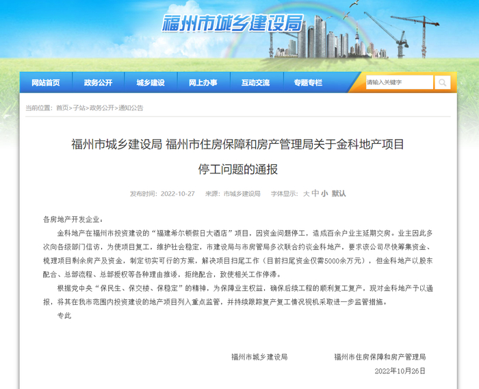 2022年10月,福州市城乡建设局、福州市住房保障和房产管理局联合发布关于金科地产福建希尔顿假日大酒店项目(推广名为金科嘉迪广场)停工问题的通报。该项目原计划今年9月30日交付,因资金问题停工,造成百余户业主延期交房。