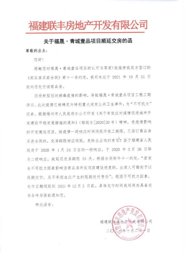 福晟青城壹品项目本应于2021年10月31日交付,延期后于2022年1月实现交付。