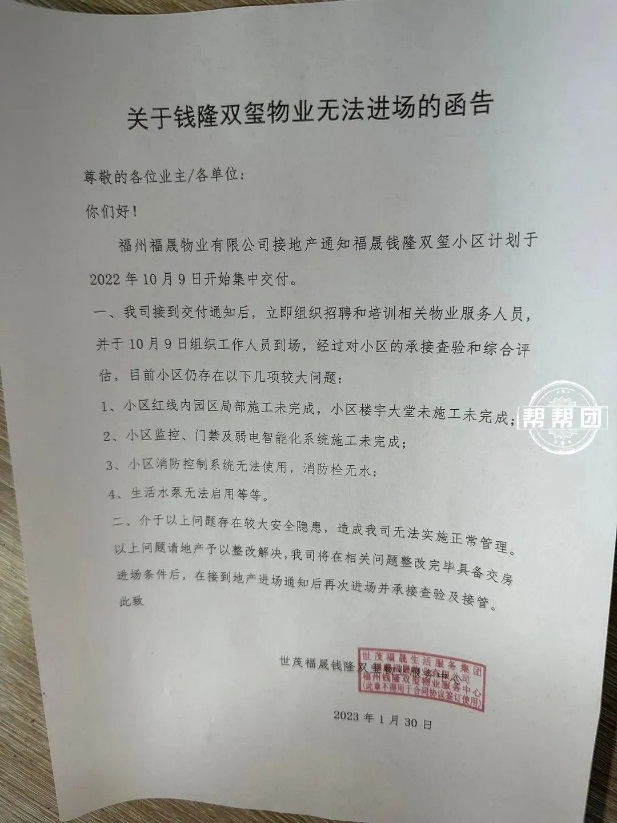 福晟钱隆双玺已交房,部分业主已经开始装修。不过小区仍存在“门都没有”“物业无法入驻”等问题。