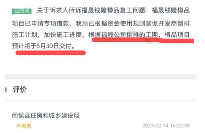 2023年2月14日,闽侯县住房和城乡建设局在回复市民咨询时称:福晟钱隆樽品项目已申请专项借款,我局已根据资金使用规则督促开发商倒排施工计划,加快施工进度。根据福晟公司倒排的工期,樽品项目预计将于5月30日交付。