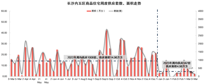 新房市场方面,2023年3月第3周长沙内五区一手住宅成交1005套、14.57万方,环比均下滑20%,持续性供货短缺致成交再幅回落。供应量上,一手住宅供应156套、2.5万方,环比分别下滑36%、50%。