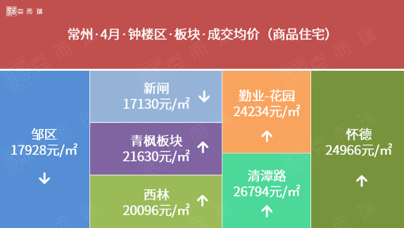 4月钟楼区新闸、邹区两大板块房价环比小幅下跌。房价环比跌幅较为明显的是新闸板块,供应结构的变化导致板块房价环比下跌。