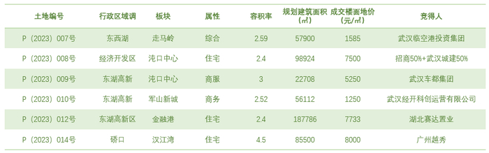 2023年第二场次【武告字(2023年)5号】公告于5月30日揭牌。本次仅出让并成交1宗纯住宅用地,P(2023)014号硚口汉江湾地块由越秀地产底价竞得,成交楼面价8000元/㎡,成交规模8.55方,拿地总额6.84亿。