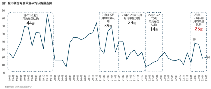 认购:5月单盘月均认购20套,环比4月的19套上涨5%,不仅高于2022年1-5月的均值14套,也高于2022年全年单盘月均认购均值17套。2023年1-5月单盘均值约25套,略低于2021年6-12月的单盘均值29套。