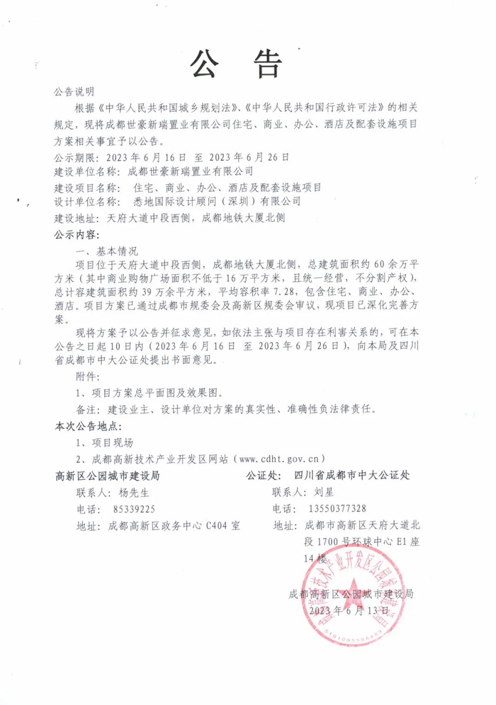 6月15日,成都高新区公园城市建设局公示了“成都世豪新瑞置业有限公司住宅、商业、办公及配套设施项目方案公告”。