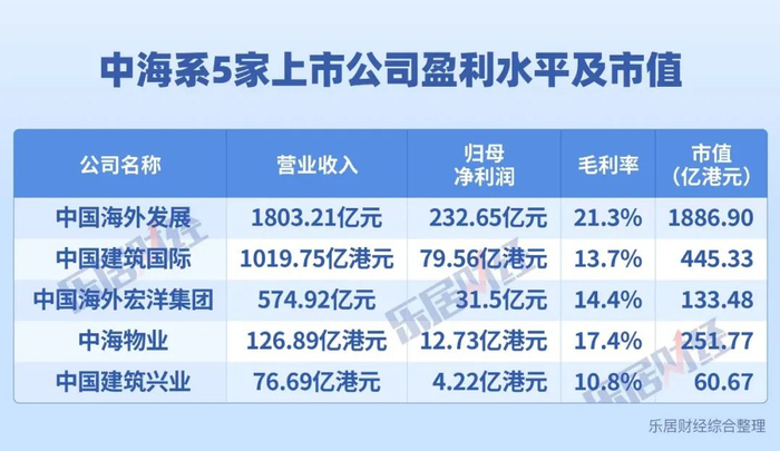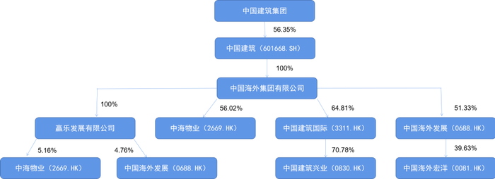 中海集团直接持有中国建筑国际(3311.HK,简称“中建国际”)64.81%股权、中海物业(2669.HK)56.02%股权、中国海外发展(0688.HK)51.33%股权。