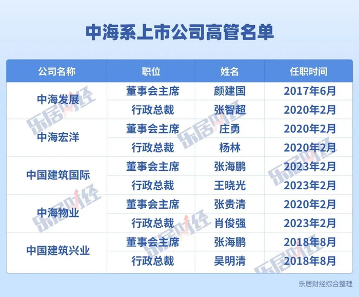 除了颜建国之外,还有中国建筑国际董事局主席张海鹏、中海宏洋董事局主席庄勇,以及中海发展行政总裁张智超等,他们均是中海集团旗下,各上市平台的一二把手。