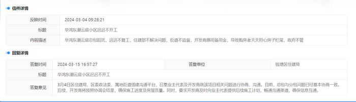 对此,钱塘区住建局回复称,“3月4日区住建局、区委政法委、属地街道搭建沟通平台,召集业主代表及开发商就该项目相关问题进行协商、沟通。目前,总包与分包问题已经基本协商一致。后续,开发商将按照协调会结果,确保施工进度及房屋质量。同时,要求开发商及时向业主代表提供后续施工计划,畅通沟通渠道,确保信息互通。”