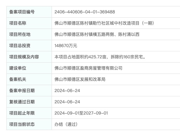 根据公示,顺德区陈村镇勒竹社区城中村改造项目(一期)位于顺德区陈村镇横五路两侧、陈村涌以西,项目占地面积约425.72亩,计划拆除约160宗民宅,总投资148670万元。该项目的起止时间为2024年9月1日至2027年9月1日。