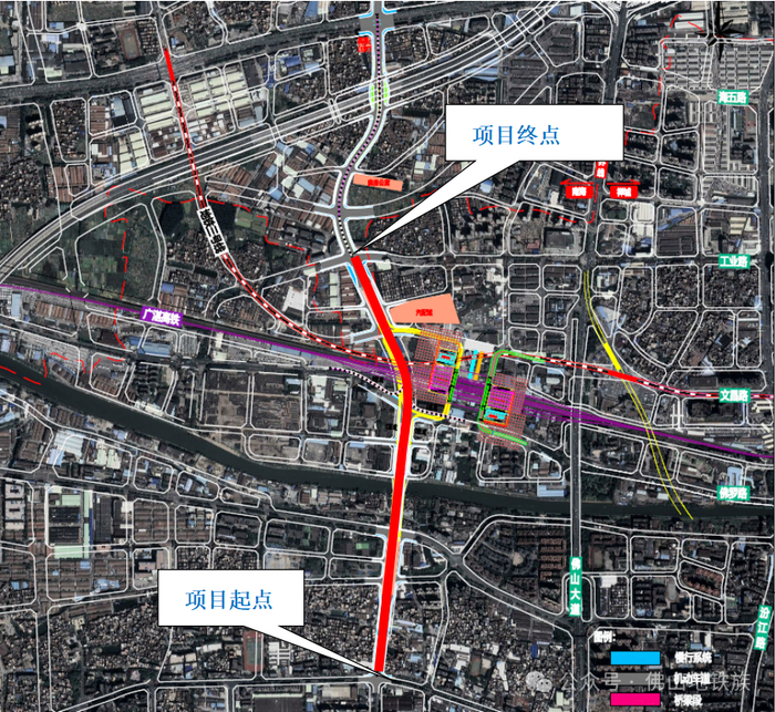 公示显示,项目南起张槎路,往北主线依次上跨塱沙路、汾江、佛罗路、文昌路(规划)后,终于工业路(规划),项目全线总长1.832Km,桩号范围K0+000~K1+832。全线含主线桥梁 1256.2m,匝道及连接线桥梁长1238m/4 座,涵洞759m/4座。其中涉铁段桥梁为202.2m;跨汾江大桥长183m。