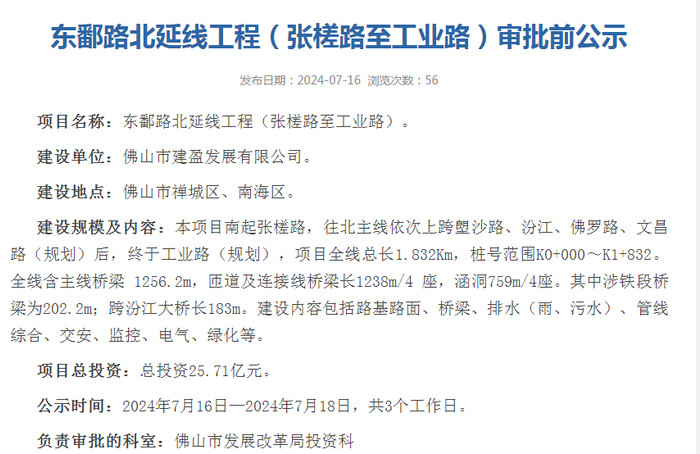 乐居从佛山发改局获悉,东鄱路北延线工程(张槎路至工业路)正在进行审批前公示,项目总投资达25.71亿元。