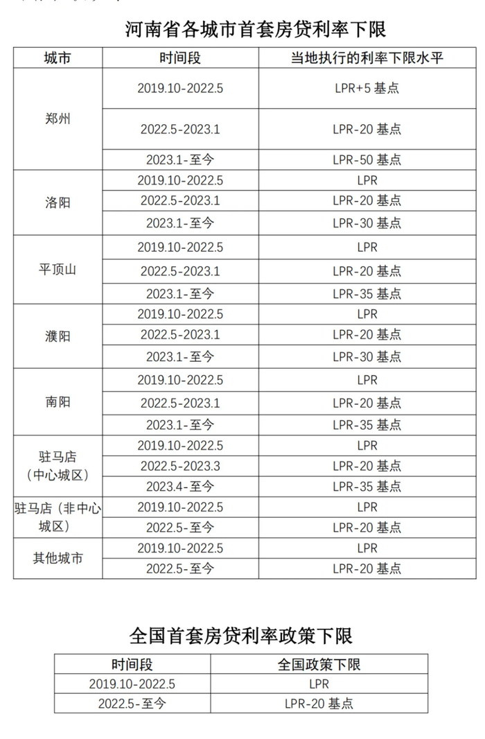 以郑州为例,2023年9月1日,中国人民银行河南省分行公布了 2019年10 月(含)以来河南省各城市首套房贷利率下限: