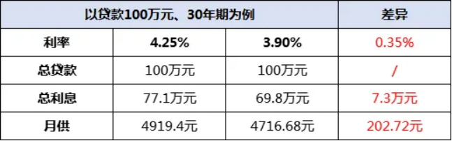 如果以贷款总额100万来算,30年期对比,相当于可以节省7万多的利息: