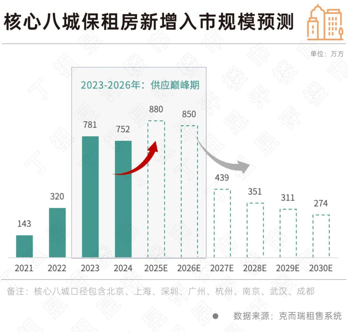 保障性租赁住房主要筹集途径包含新建及改建,当前核心八城新建项目主力支撑入市供应。根据测算模型,预计到2025年新增入市保租房量为880万方,2026年为850万方,而后市场在历经2023-2026年的供应高峰后,开始逐步回落至年均340万方左右。
