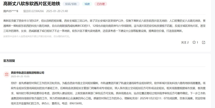 1月25日,西安市轨道交通集团有限公司回复:为配合西安市国土空间规划编制,市轨道集团开展了轨道交通线网专业规划研究,软件新城片区和科技六路有地铁线路覆盖。