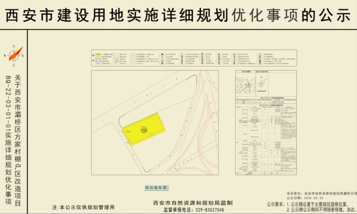 2025年3月25日,西安市自然资源和规划局发布《关于西安市灞桥区方家村棚户区改造项目BQ-22-03-01地块实施详细规划优化事项的公示(公示期限7天)》。