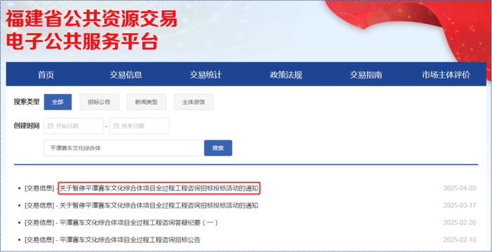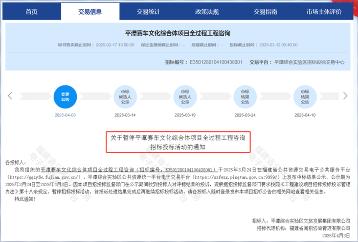 4月3日,福建省公共资源交易电子公共服务平台发布信息称,因本项目招投标监督部门在公示期间收到投标人对评标结果的投诉,该招标活动已被暂停。