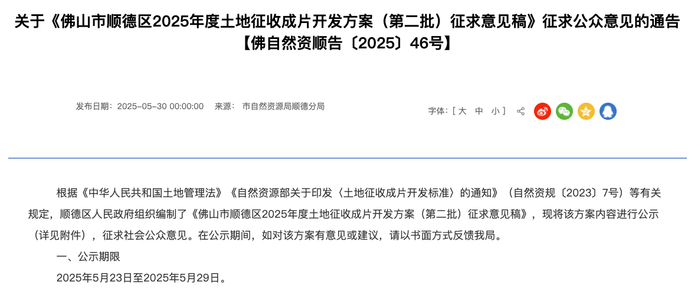 5月23日,顺德区网站发布了关于《佛山市顺德区2025年度土地征收成片开发方案(第二批)征求意见稿》征求公众意见的通告。