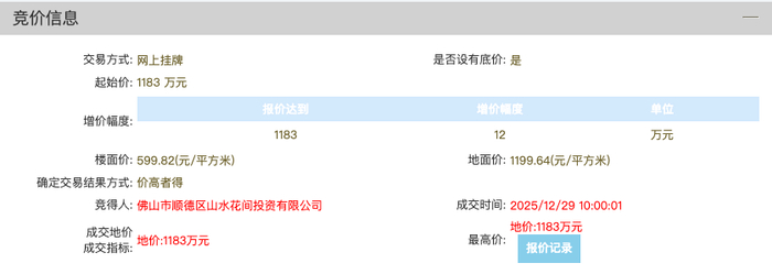12月29日,顺德文旅旗下的佛山市顺德区山水花间投资有限公司以底价1183万元斩获了位于均安李小龙乐园旁一宗占地近万㎡商服地,折合楼面价仅600元/㎡。