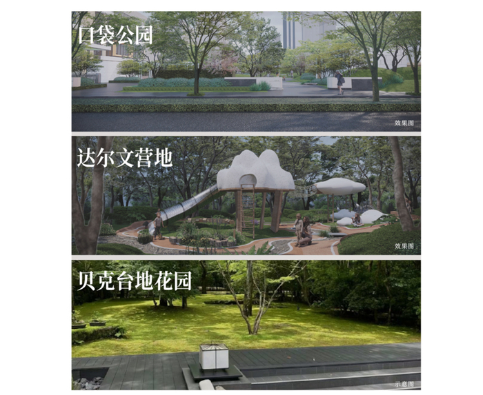 南侧视野开阔,与城市代建的口袋公园自然相接,形成一片专属的绿色前厅;北侧的“曲园”则以蜿蜒小径和丰富植物,引领从城市节奏自然过渡到居家心境。更有东侧的“贝克台地花园”与“达尔文营地”环抱,推窗可见艺术草坪,转身可入草阶林地,更有林下树屋静候,为孩子提供探索自然的成长空间。