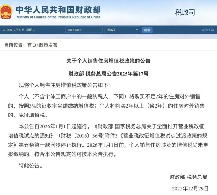12月29日,财政部、国家税务总局发布“关于个人销售住房增值税政策的公告”。