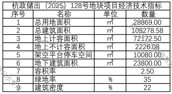 地块总用地面积28869平方米,总建筑面积约108278.58平方米,容积率2.5,建筑密度22%,绿地率35%。