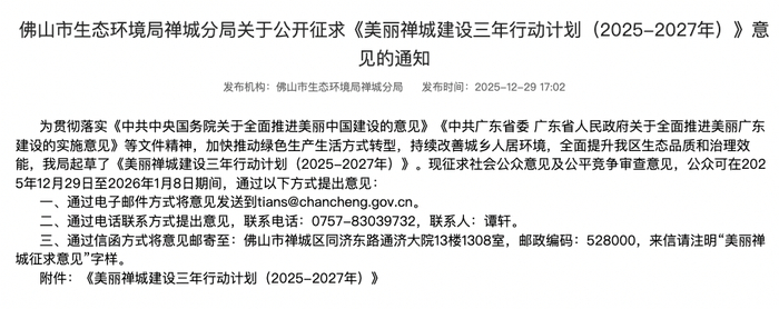 日前,佛山市生态环境局禅城分局发布关于公开征求《美丽禅城建设三年行动计划(2025-2027年)》意见的通知。