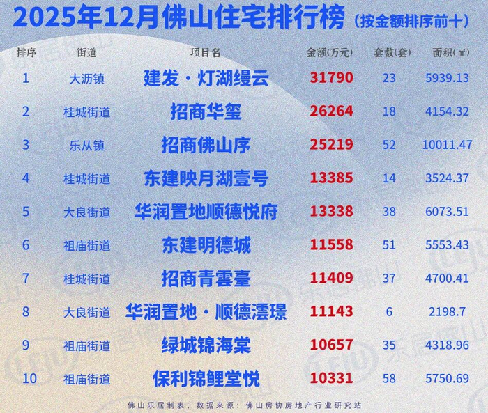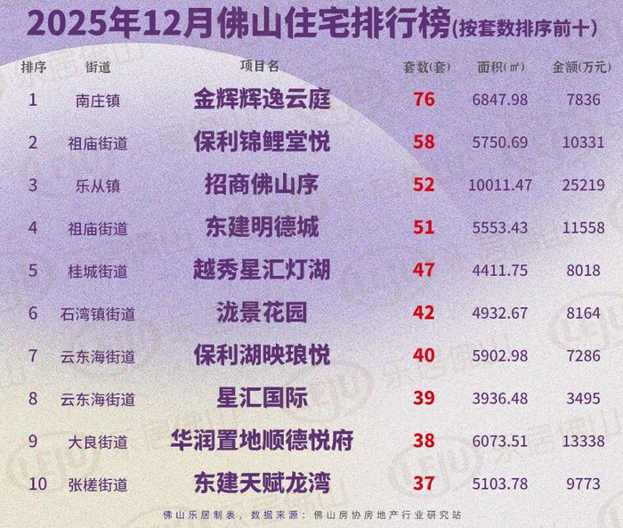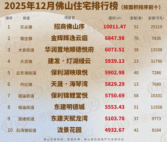 2025年最后一份月榜揭晓!根据佛山房协房地产行业研究站数据显示,位于禅城南庄的金辉辉逸云庭以76套的网签量问鼎12月佛山楼市榜首!保利锦鲤堂悦、招商佛山序和东建明德城网签量也均突破50套,分居12月榜单的二到四位。