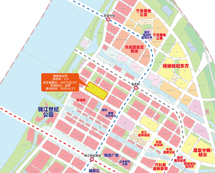 钱江世纪城北的奥映世纪轩,由金帝集团于2025年6月27日,经98轮竞价以55.78亿元竞得,楼面价54472元/㎡、溢价率21.05%,共规划9幢17-23F江景大平层。