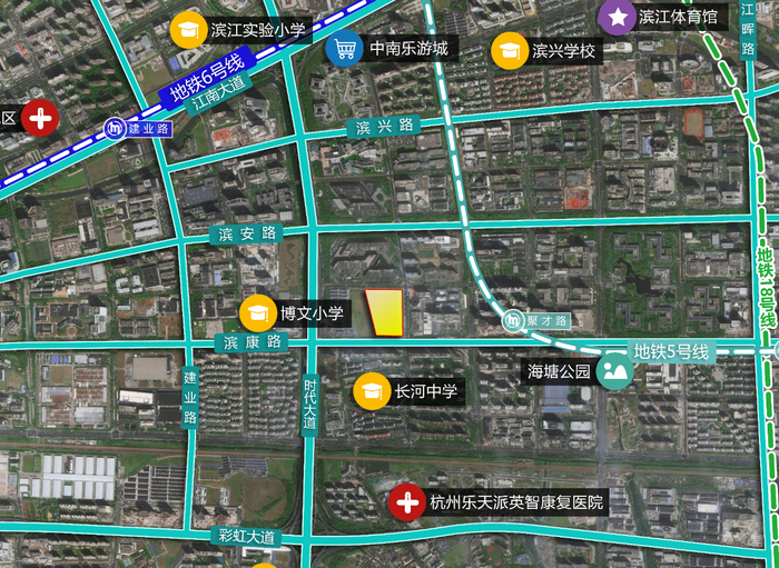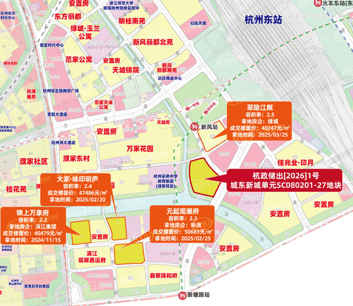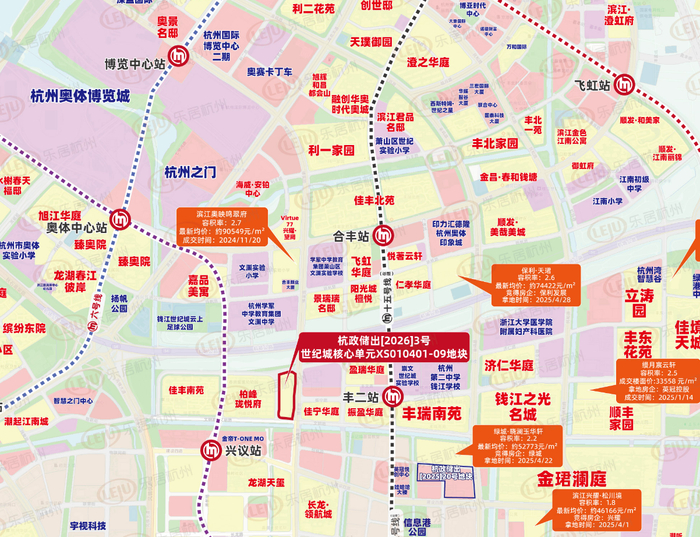 襄七房单元FG04-B1/B2-B22等地块位于滨江区,于2025年2月商改住调整而来,住宅占地面积57.6亩,容积率2.5。周边集聚网易、阿里巴巴、华为等企业,地铁5号线聚才路站直线约450米。