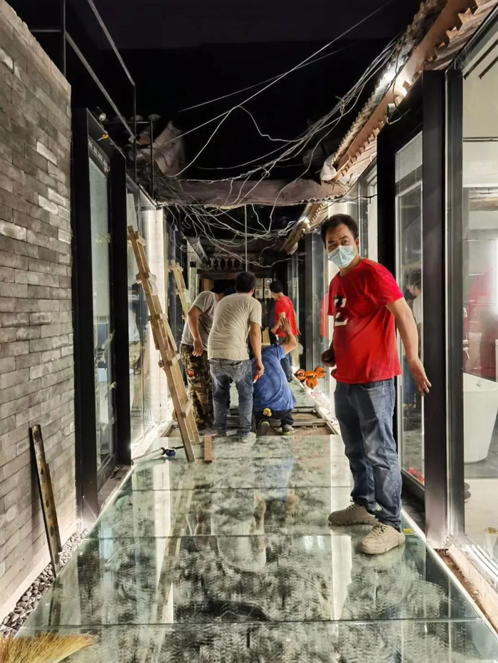 第7天到第9天,开始做地面。先把地面重新铺好,才能做龙骨,立完龙骨之后,再测量完每块玻璃具体的尺寸,下单购买玻璃、磁砖、木地板等等。