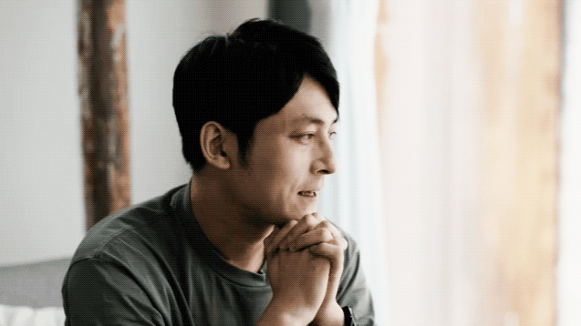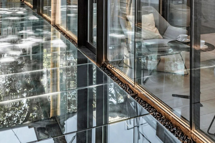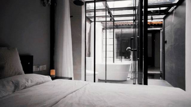 小院的另一侧是主卧,由于主卧室是狭长形的,内部照不到光线,因此申江海把墙面到和天花板都做成玻璃,光线可以自然地带进来,同时保留卧房的隐密性。