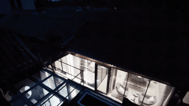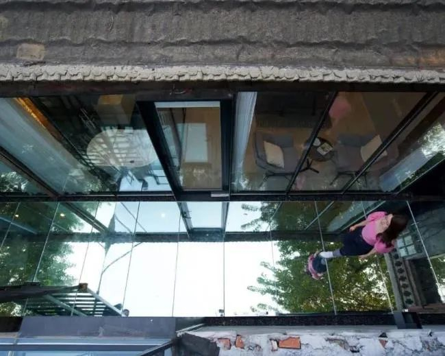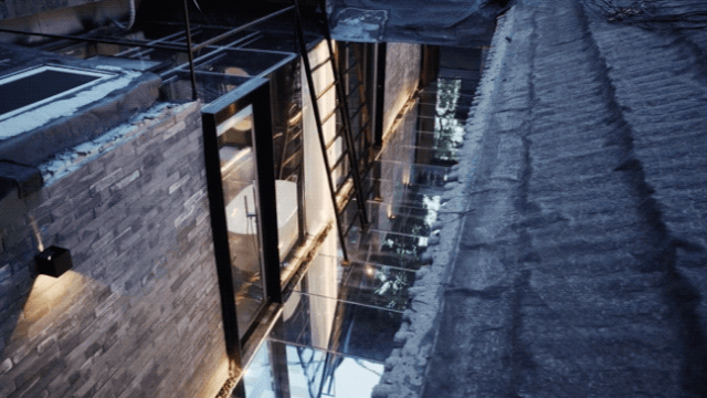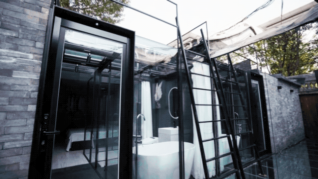 主卧的卫浴天花板也是透明的,可以爬梯上去。露台上的视野更开阔了,四合院的屋瓦、整条街的胡同景色加上地面的反射,又是另一种视觉感受。