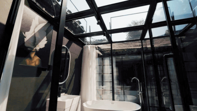 透明浴室的房顶上就是露台浴缸直接挨着玻璃放,拉开帘子就能边泡澡边看窗外,设计很大胆,但刘天萌自己一人住,家里就没有太多顾忌。