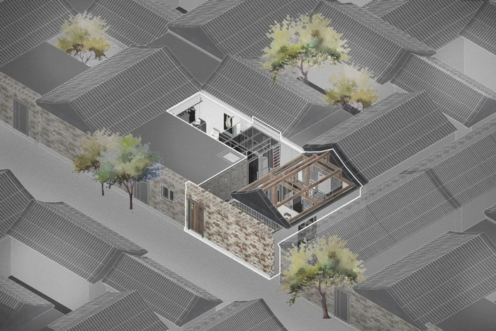 胡同房子的轴测图房子不是传统的四合院,格局被切割过。左边的房间紧挨着邻居家,原来这里和隔壁是一大户,硬生生被隔成两间,所以墙面、水电、管线都得和邻居共用。