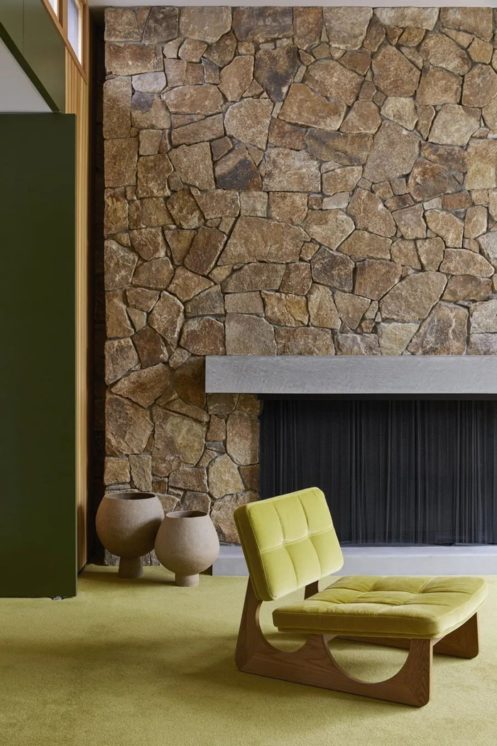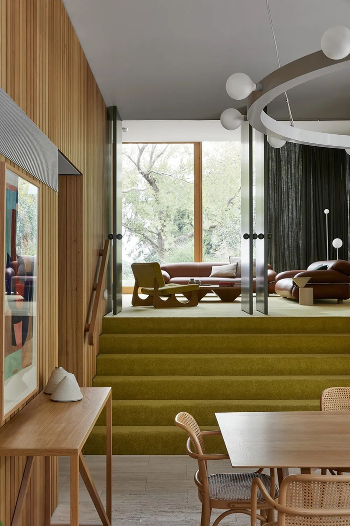 室内的空间充满现代主义,球型的壁炉成为这里趣味性的存在,也与室外圆形泳池相呼应。毛绒的绿色地毯看起来非常舒适清新。轻盈的吊灯让这里更加通透。