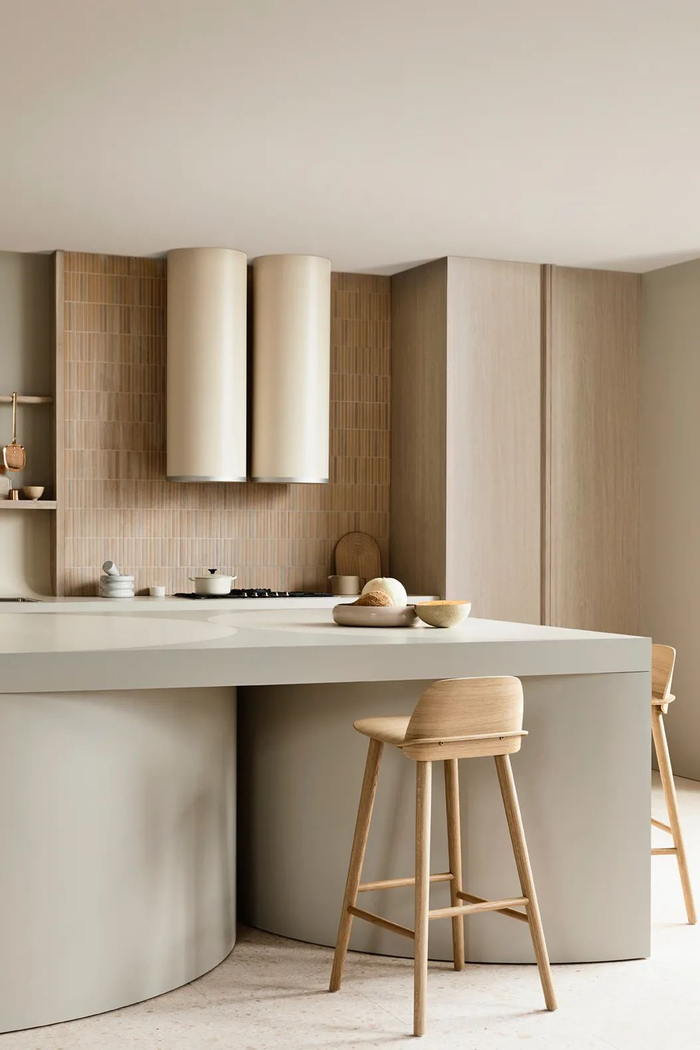The Expansive Kitchen是空间系列中的第一个。平静朴素的的画面让人心情放松下来。平整的墙面与台面带来稳重严肃与理性,木制的搭配增加空间的温度,两个圆柱形的油烟系统除了功能上的作用,形式上也成为这里的亮点之一。
